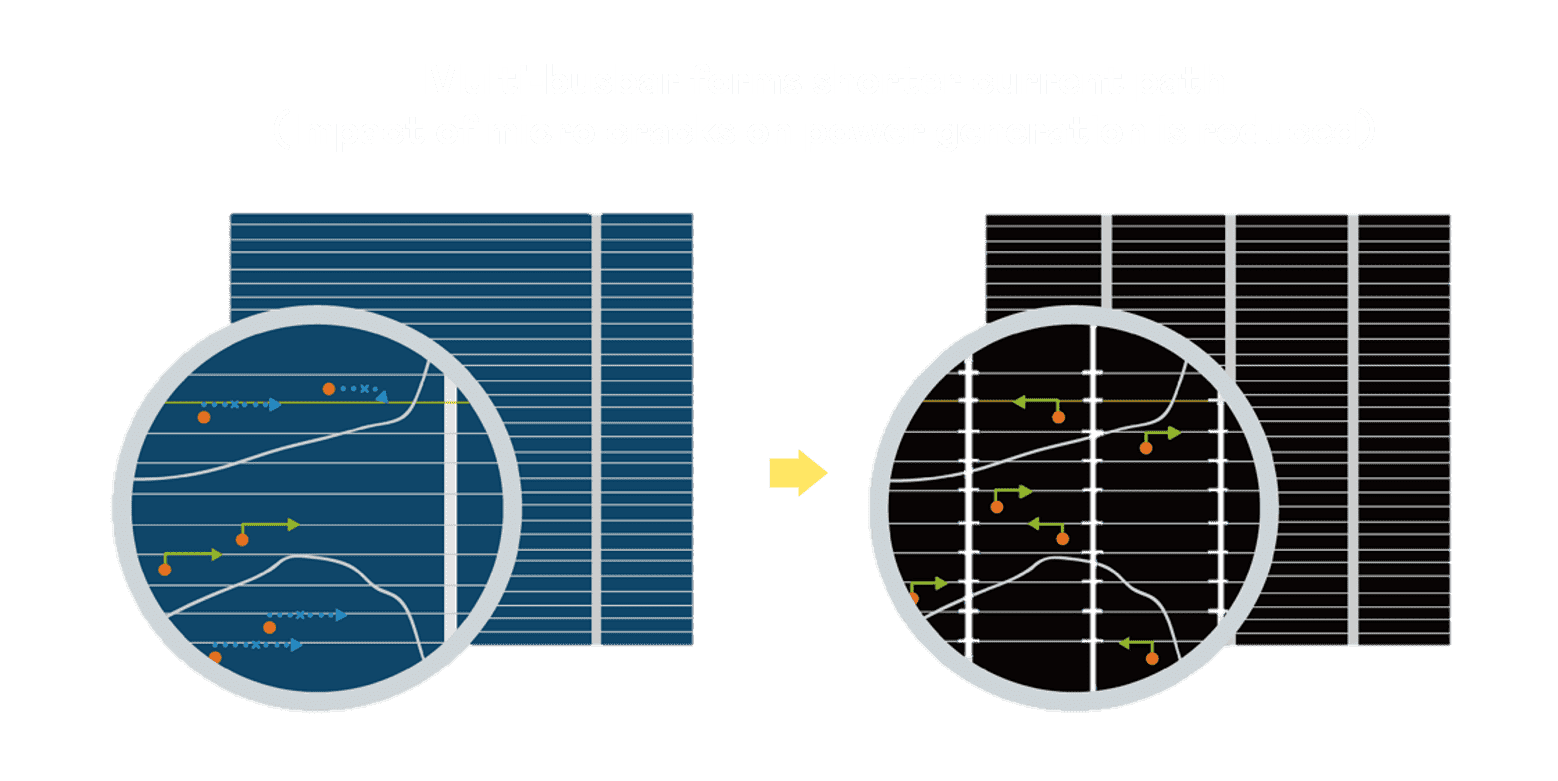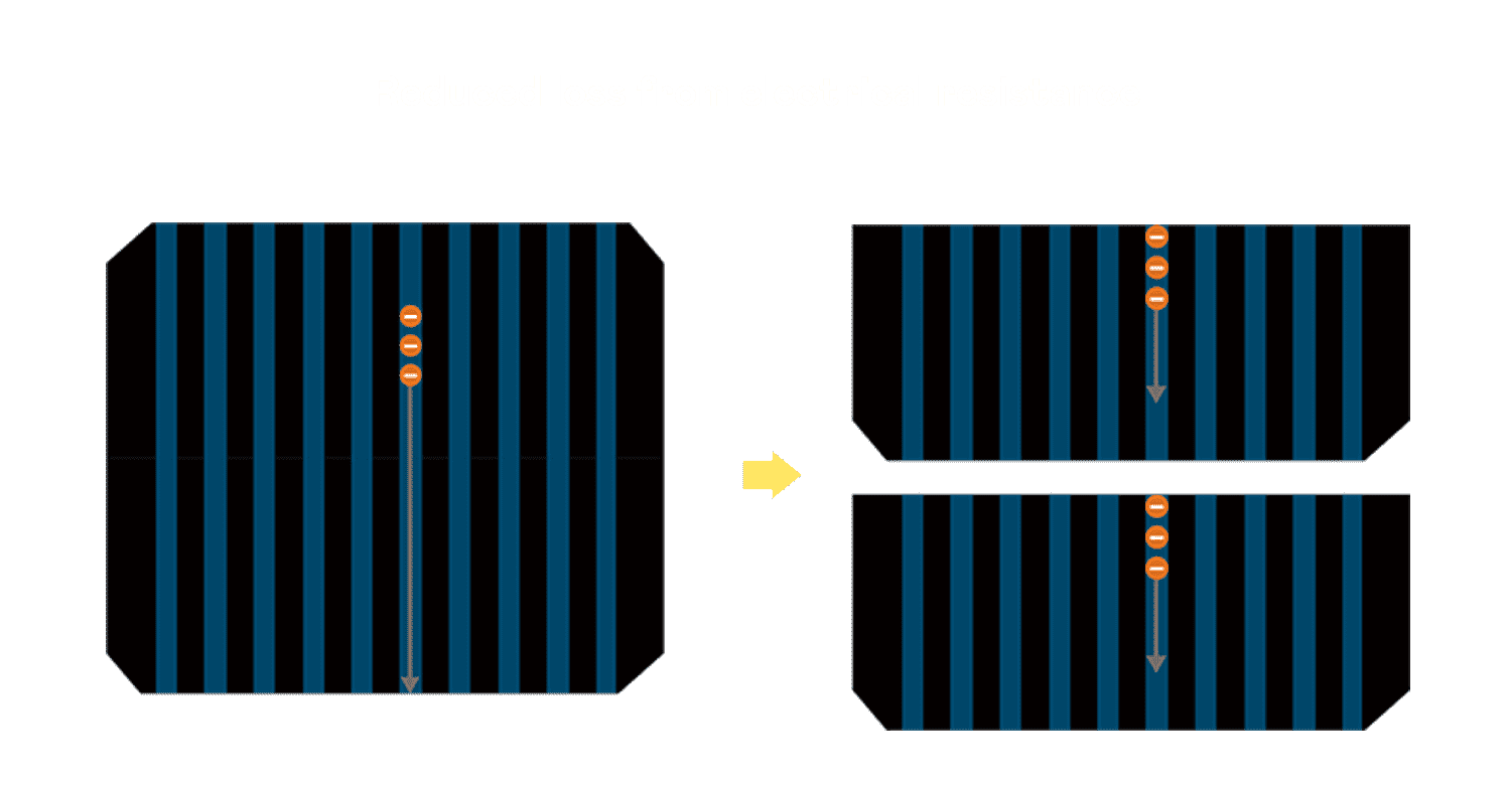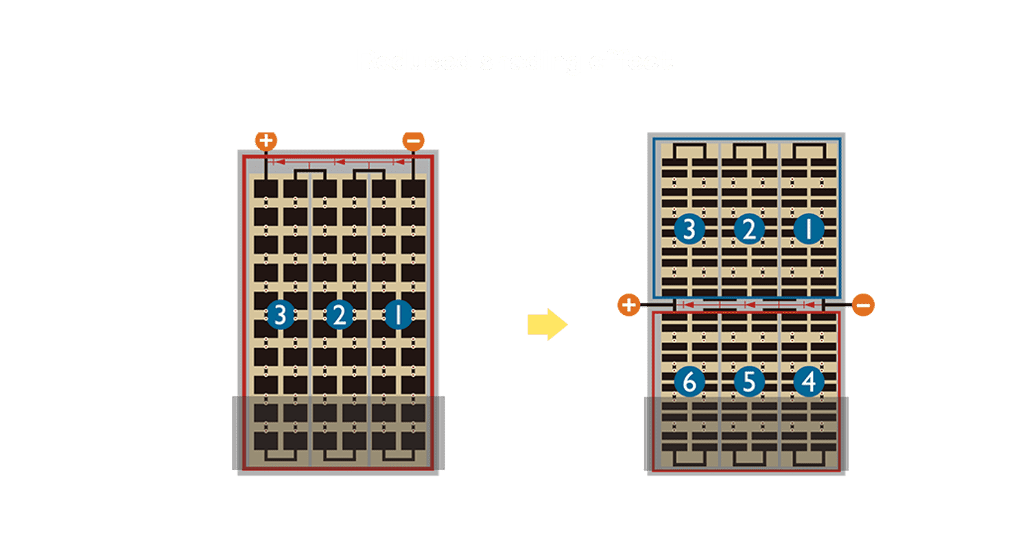 - 结合半切电池,,,降低遮阴影响、、、、提升模组抗隐裂能力、、并减少电阻损耗,,,,进一步提升模组发电效能。。
