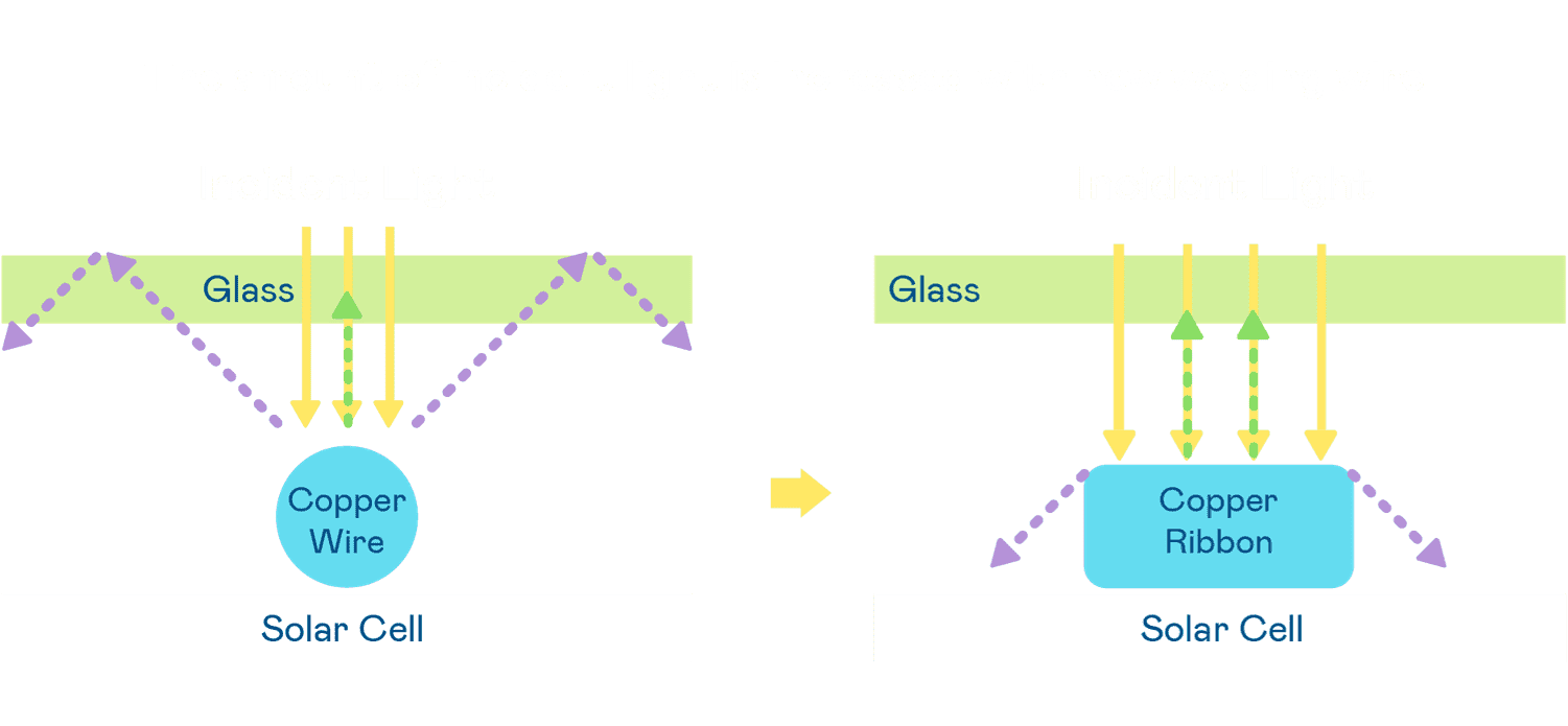 - 电池使用多条铜导线 (Copper wire) 于电池片上形成较短的电流路径,,提高电流收集效率,,采用圆形设计的铜导线较传统扁平式的铜焊带 (Ribbon),,可增加入射至电池的光线量。。。